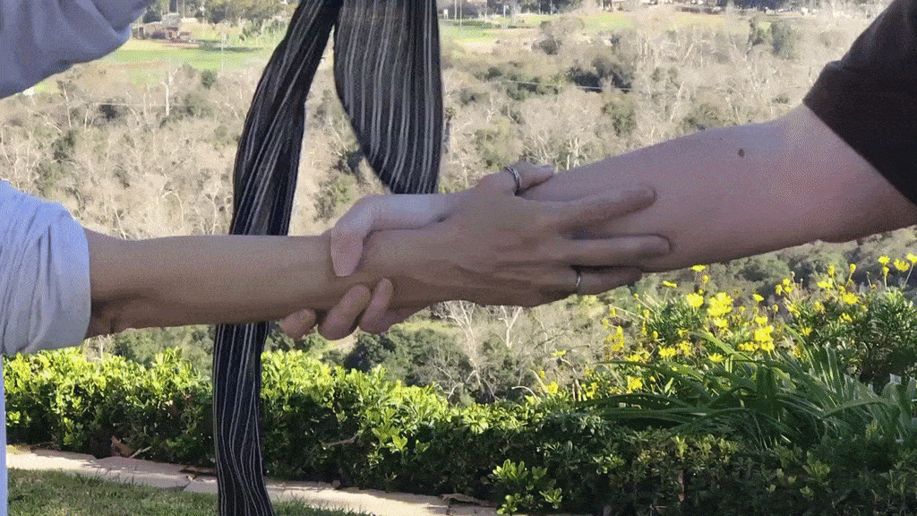 The couple crosses both of their arms, grasping each other’s hands so that their arms form a natural infinity symbol. The cord or ribbon is loosely wrapped around their clasped hands as many times as needed to complete the ceremony wording. At the end, the officiant ties the two ends together under the couple’s hands in any standard knot desired. The officiant grasps the cord and the couple removes their arms. The cord is handed to the couple for them to place into a special box or container for safekeeping.
